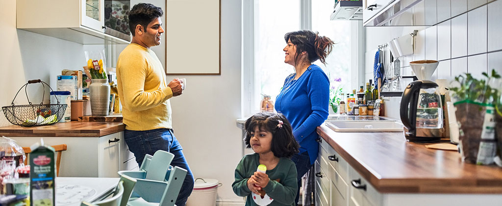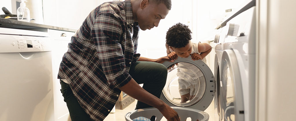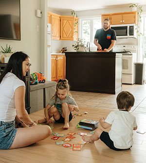 In the morning, each parent gets one child dressed. Mom takes them to daycare and Dad picks them up at the end of the day. “Once we’re home from work, Chloé looks after the kids while I make dinner,” explains Dominique. “Then she does dishes and laundry while I handle bathtime.” On weekends, they try to do a few chores with the kids, like raking leaves in the yard. They have a big calendar on their fridge to keep track of appointments, parties, and activities. It helps them share the mental load, since they can both see what’s coming up and plan who’s doing what together.