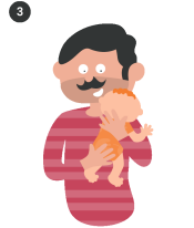 Lorsque votre bébé est couché sur une surface plane, penchez-vous le plus possible pour rapprocher votre torse de son corps avant de le prendre. Placez ensuite une main sous sa tête et l’autre sous ses fesses (image 1). Soulevez-le lentement et installez-le confortablement lové contre vous, dans l’une des positions suivantes.